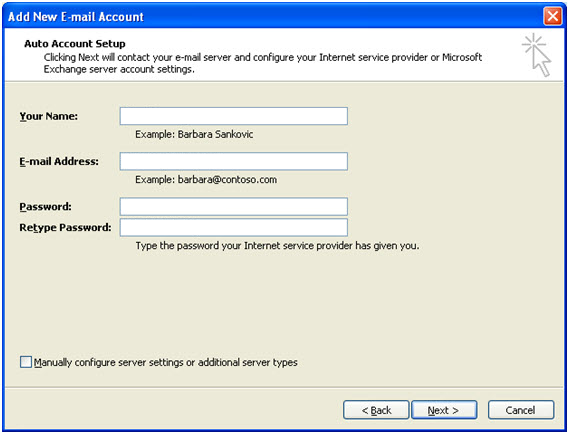 Make sure "Manually configure server settings" is not selected. Then click Next. -